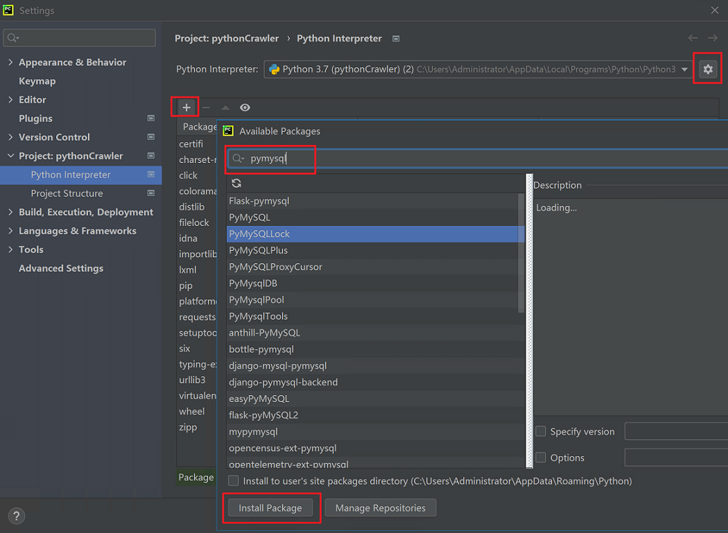 点击 + 加号,填写需要安装的安装包,安装即可