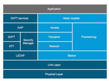 蓝牙低功耗协议(深蓝色)内的蓝牙网状网络堆栈(浅蓝色)排列