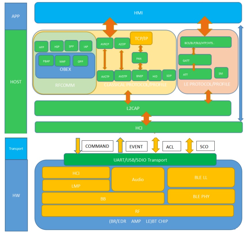 - HCI(HOST CONTROLLER INTERFACE):主机控制器接口层,HCI层在芯片以及协议栈都有,芯片层面的HCI负责把协议栈的数据做处理,转换为芯片内部动作,并且接收到远端的数据,通过HCI上报给协议栈。