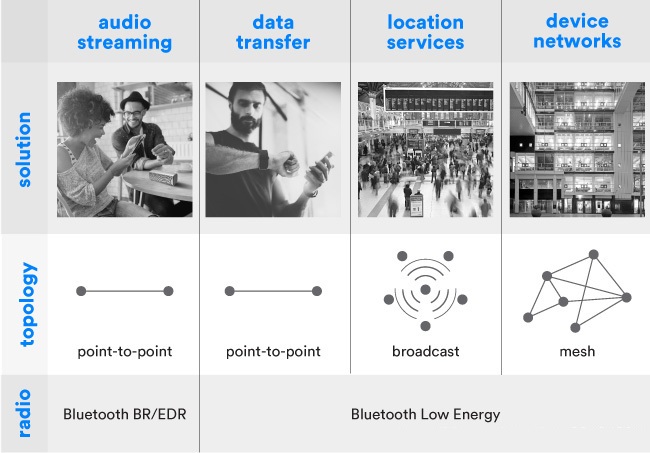 从左至右依次为:经典蓝牙(BR/EDR)、双模蓝牙(同时支持BR/EDR/LE)和低功耗蓝牙(BLE)。