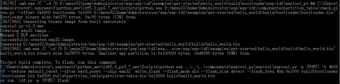 Project build complete. To flash, run this command: C:\Users\Administrator\.espressif\python_env\idf5.0_py3.7_env\Scripts\python.exe ..\..\..\components\esptool_py\esptool\esptool.py -p (PORT) -b 460800 --before default_reset --after hard_reset --chip esp32 write_flash --flash_mode dio --flash_size detect --flash_freq 40m 0x1000 build\bootloader\bootloader.bin 0x8000 build\partition_table\partition-table.bin 0x10000 build\hello_world.bin or run 'idf.py -p (PORT) flash'