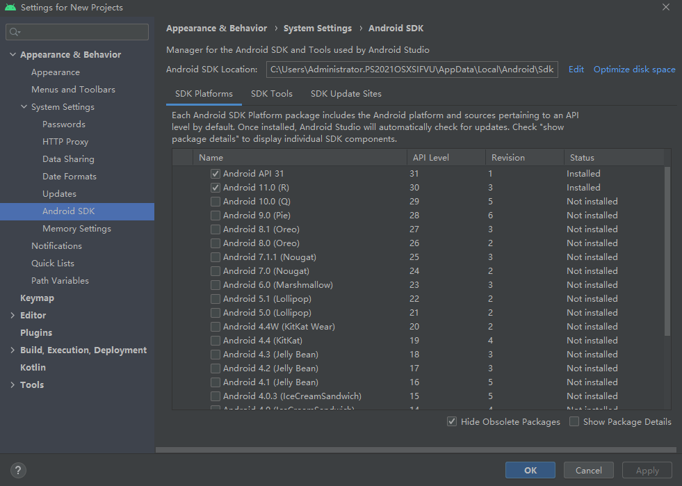 打开 “Android SDK”"SDK Platforms"里面的版本降一下,使用下图中 API level为30的